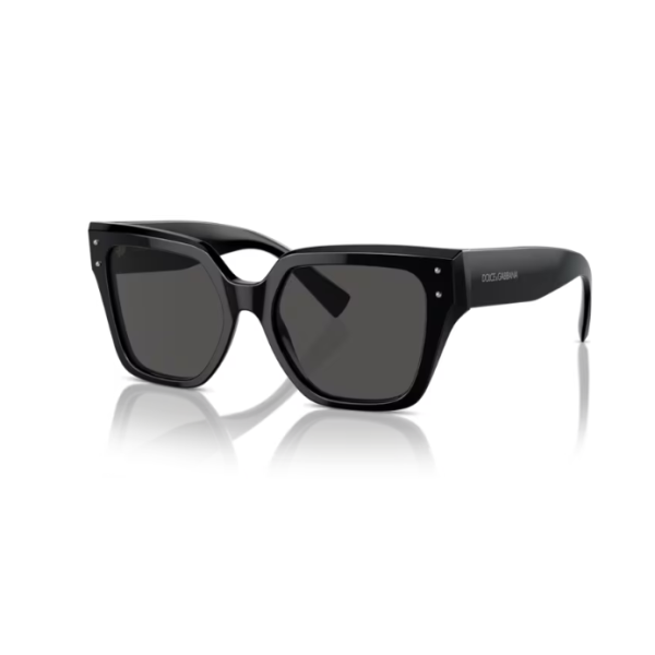 Em uma deslumbrante armação quadrada em acetato, detalhes em pinos metálicos na frente e logos Dolce&Gabbana nas hastes se destacam.