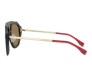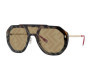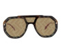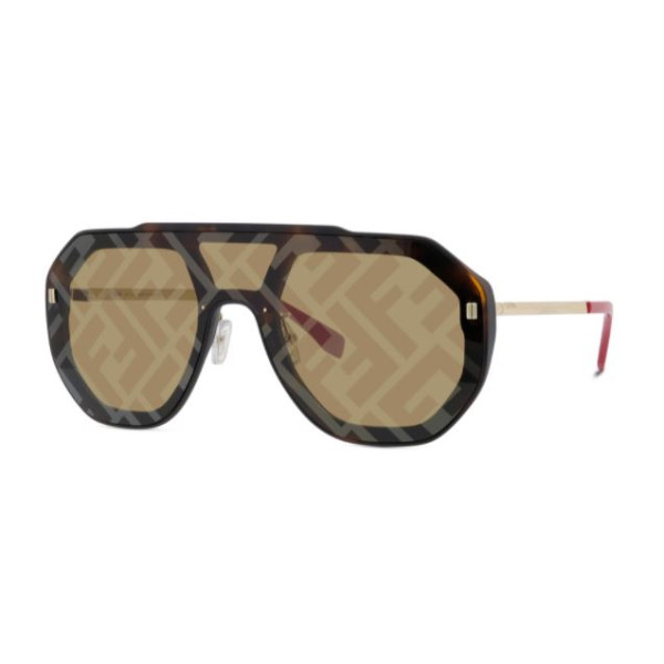 Armação em formato máscara moldada por acetato na cor Havana, com hastes de metal douradas e ponteiras vermelhas. A única lente marrom é decorada com uma impressão do logotipo FF com efeito espelhado dourado. Plaquetas de nariz ajustáveis com o logotipo Fendi.