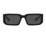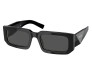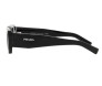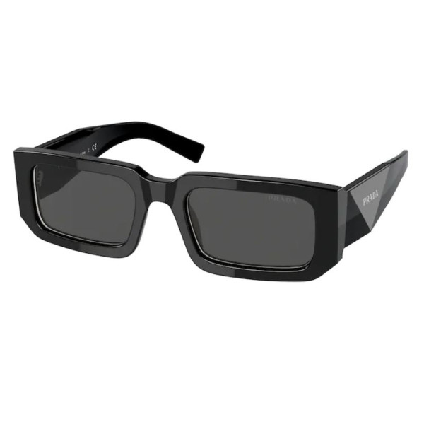 Óculos de sol em acetato da coleção Prada Symbole. A armação retangular grossa é feita com uma combinação sofisticada de camadas em acetato destacadas pelas cores contrastantes nos aros. A construção tridimensional das hastes é decorada com uma interpretação iconográfica do logotipo triangular tradicional da Prada.