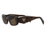 Óculos de sol em acetato da coleção Prada Symbole. A armação retangular enfatiza os aros vanguardistas da armação na parte da frente, graças a uma combinação exclusiva de camadas de acetato. A construção tridimensional das hastes é decorada com uma interpretação iconográfica do logotipo triangular tradicional da Prada.