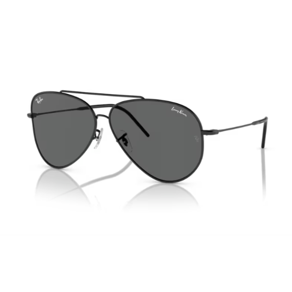 Um Aviator Reverse completamente preto em edição limitada com a assinatura de Lenny Kravitz gravada na lente com uma tecnologia avançada, transformando o formato tradicional da lente de convexo para côncavo.